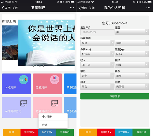 点击'账号管理'--'我的资料',跳出如右图所示:我的资料即可修改(注:名称根据微信名的变动而变动,出生年月日和性别一经改动,不可再次修改)